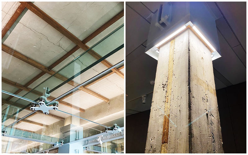 左の写真をご覧ください天井のガラスを支えているDPG工法の梁までも合わせガラスで透明です。より、文化財の施設を見やすく考えられてます。びっくり!!